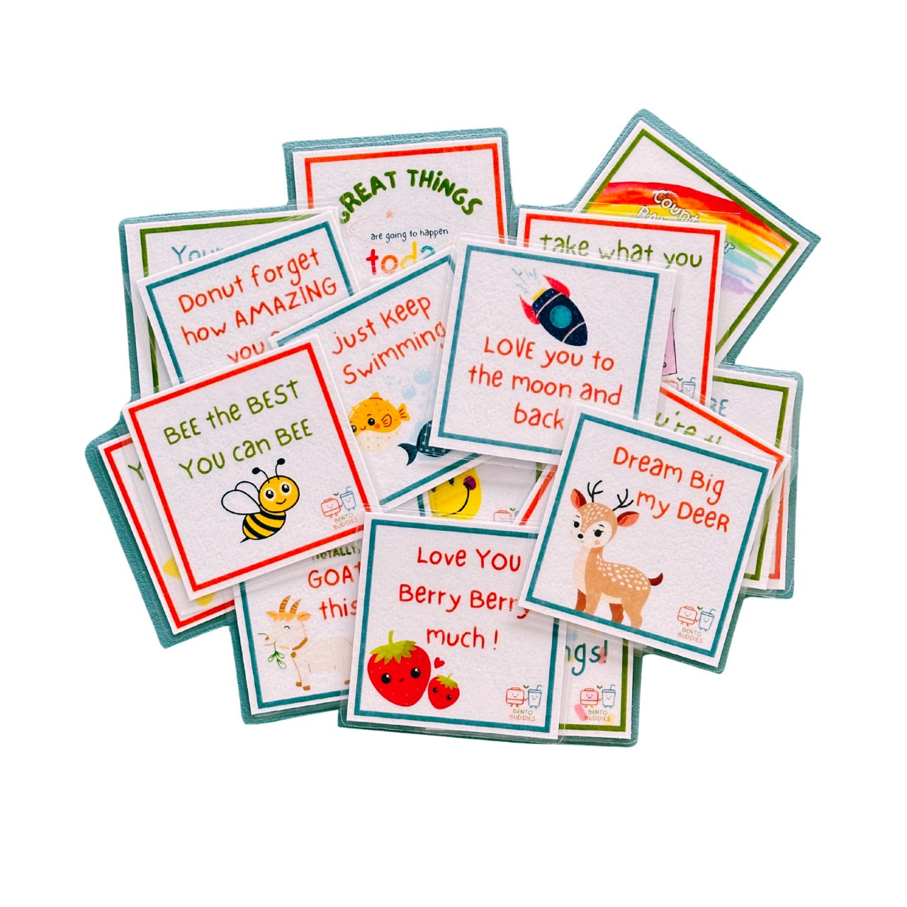 Perfect for adding a little extra love to your Bento Buddies lunchbox. Each set includes 20 uplifting notes you can reuse— adding smiles, confidence, and a sprinkle of positivity to your child’s day.